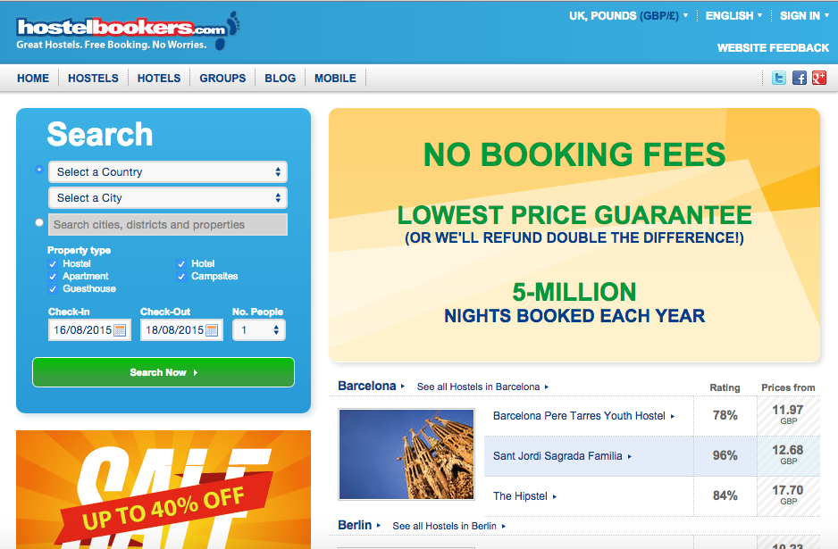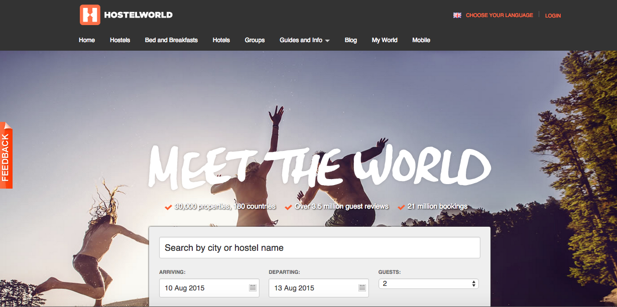 1) จองผ่านเวบไซต์ที่รวมหลายๆโฮสเทลไว้ให้เลือก มักจะมีรีวิว, เรตติ้งที่โฮสเทลนั้นได้จากผู้ที่เคยมาพัก ดูว่าเค้ามีอะไรให้บ้าง เช่น ผ้าเช็ดตัว ผ้าปูที่นอน ไวไฟ ส่วนตัวจะพยายามเลือกโฮสเทลที่ได้เรตติ้ง 80% ขึ้นไปและอ่านคนที่มาคอมเม้นต์ด้วยค่ะ ว่ามีอะไรที่เค้าชอบไม่ชอบบ้าง อย่างเวบที่ใช้บริการบ่อยๆคือ hostelworld, hostelbookers ค่ะ เอาตัวอย่างหน้าเวบมาให้ดูกัน วิธีจองก็ใส่ชื่อประเทศ ชื่อเมือง พร้อมวันที่ที่เราจะไปอยู่ค่ะ เว็บจะทำการค้นหามาให้เรา พร้อมบอกข้อมูลต่างๆประกอบการตัดสินใจค่ะ
